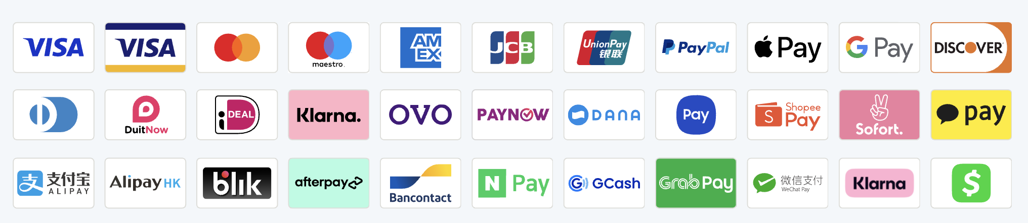 • E-wallets and third-party payments (PayPal, Apple Pay, Google Pay, Dana, PayNow, Shopee Pay, OVO, GCash, GrabPay, Alipay, Alipay HK, WeChat Pay, BLIK, N Pay, Bancontact, Sofort, Afterpay, Klarna, DuitNow, iDEAL, Outflow)